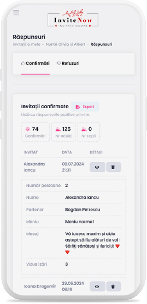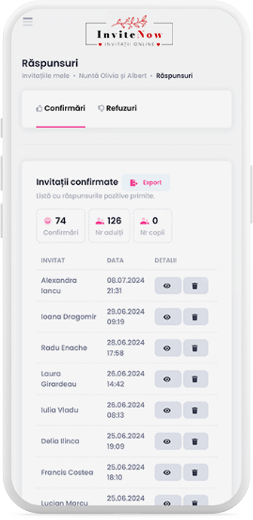 După ce ai transmis invitațiile, vei primi confirmările pe email și vei putea urmări în contul tău activitatea invitației (vizualizări, confirmări, refuzuri), toate la un singur loc.