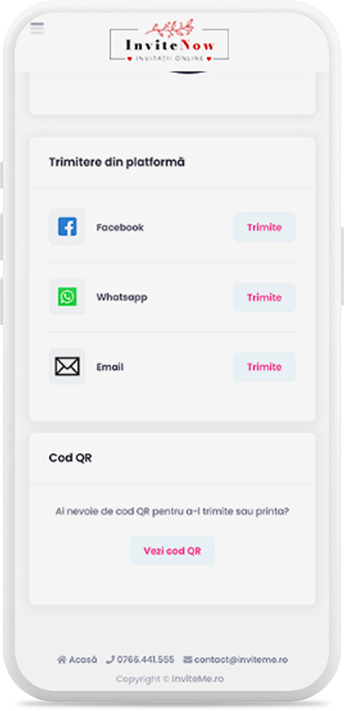 Când totul este gata, poți începe distribuirea invitației imediat, direct din platformă pe Facebook, Whatsapp, Email sau copiezi link-ul și îl transmiți, separat de platformă, prin orice mijloc de comunicare preferi. Tu decizi!